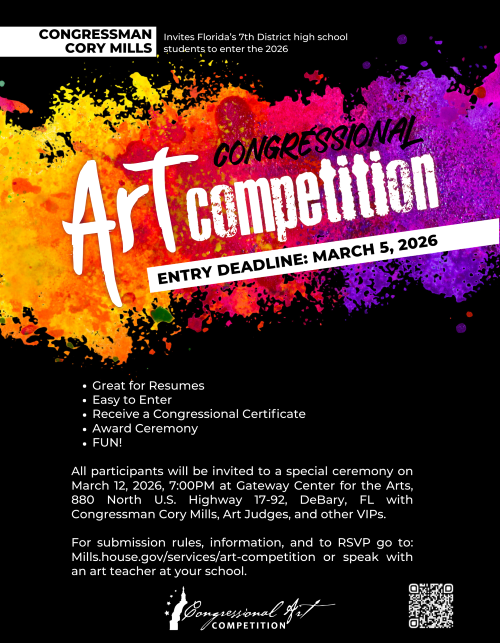 The Artistic Discovery Contest is open to all high school students in our District. The winning artwork of our district's competition will be displayed for one year in the U.S. Capitol. The exhibit in Washington will include the winning artwork from all participating districts from around the country. The winning artwork is also featured on House.gov's Congressional Art Competition page.